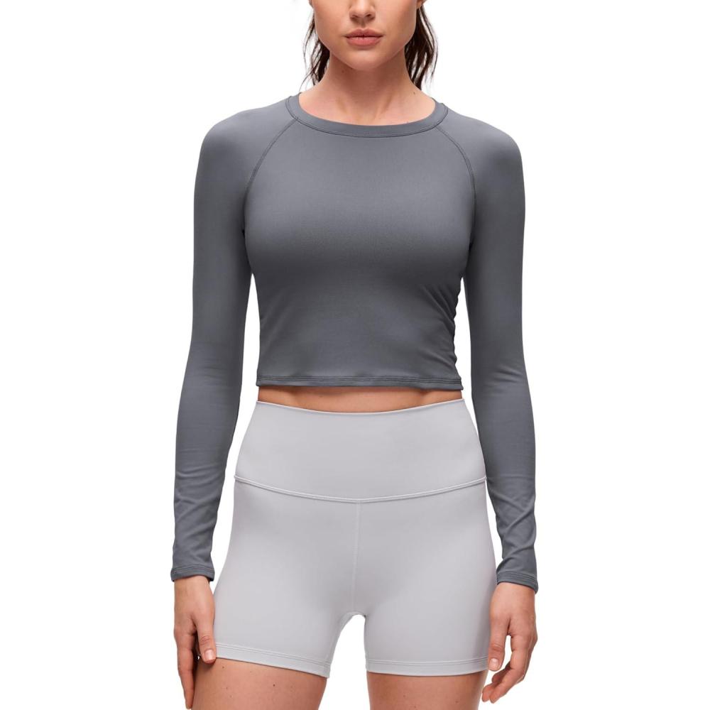 CRZ YOGA Brushed Workout Long Sleeve Shirts for Women – Warm Athletic Running Gym Yoga Tops Breathable Crop Crewneck Tees(Ash Grey)