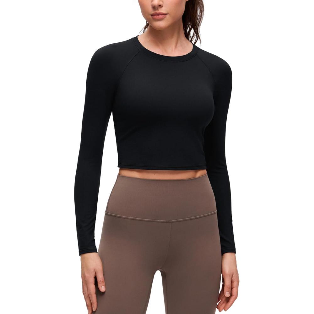 CRZ YOGA Brushed Workout Long Sleeve Shirts for Women – Warm Athletic Running Gym Yoga Tops Breathable Crop Crewneck Tees(Black)