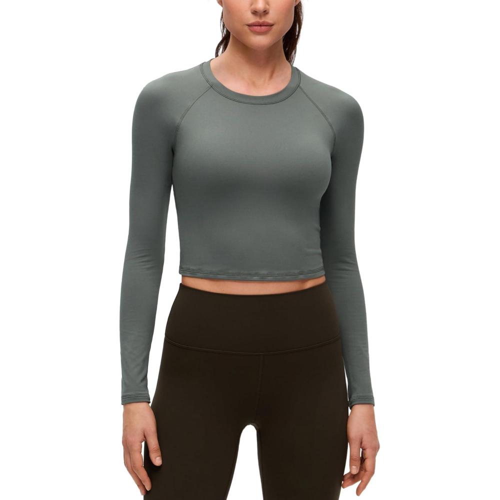 CRZ YOGA Brushed Workout Long Sleeve Shirts for Women – Warm Athletic Running Gym Yoga Tops Breathable Crop Crewneck Tees(Grey Sage)