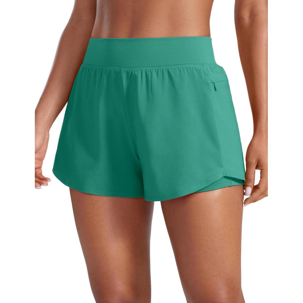 CRZ YOGA 2 in 1 Double Layer Running Shorts for Women 3″ – High Waisted for Athletic Tennis Workout with Zip Pockets(Cascadia Green)