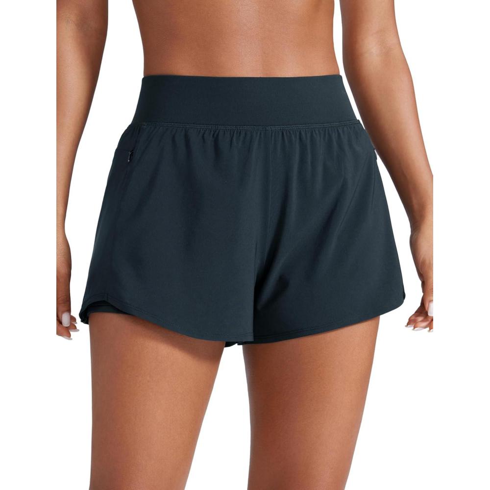 CRZ YOGA 2 in 1 Double Layer Running Shorts for Women 3″ – High Waisted for Athletic Tennis Workout with Zip Pockets(Stelindigo)